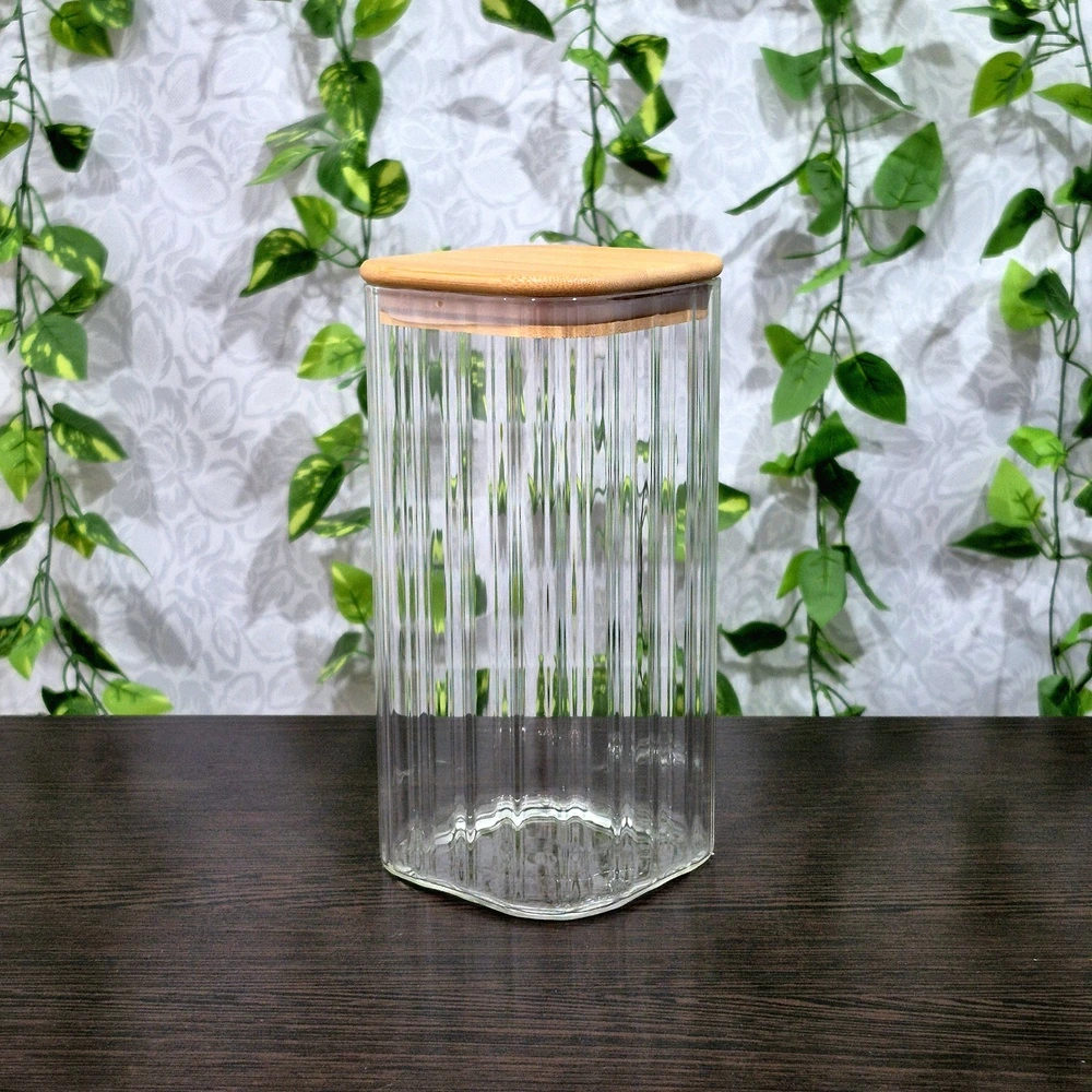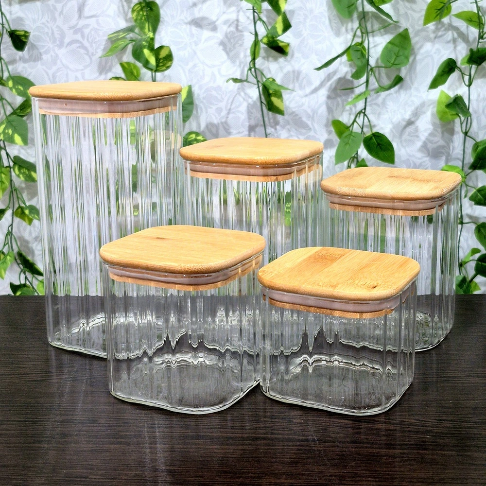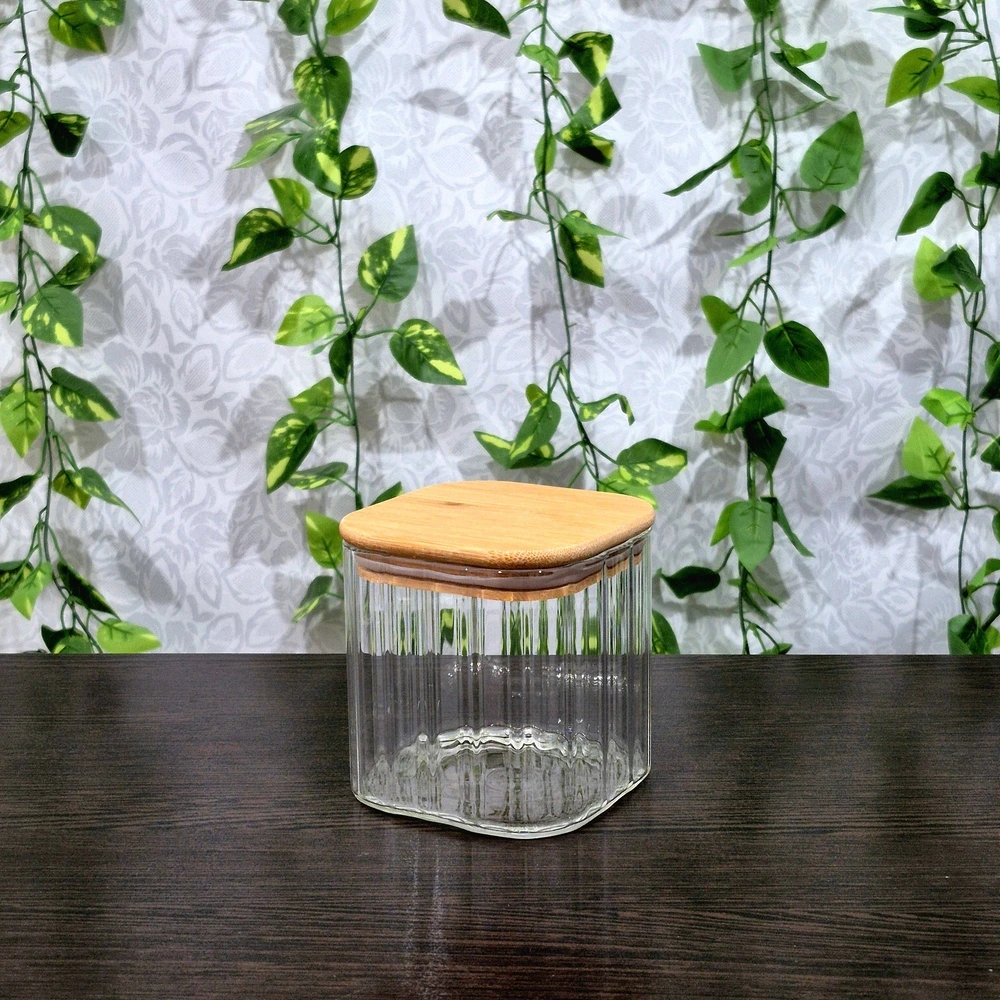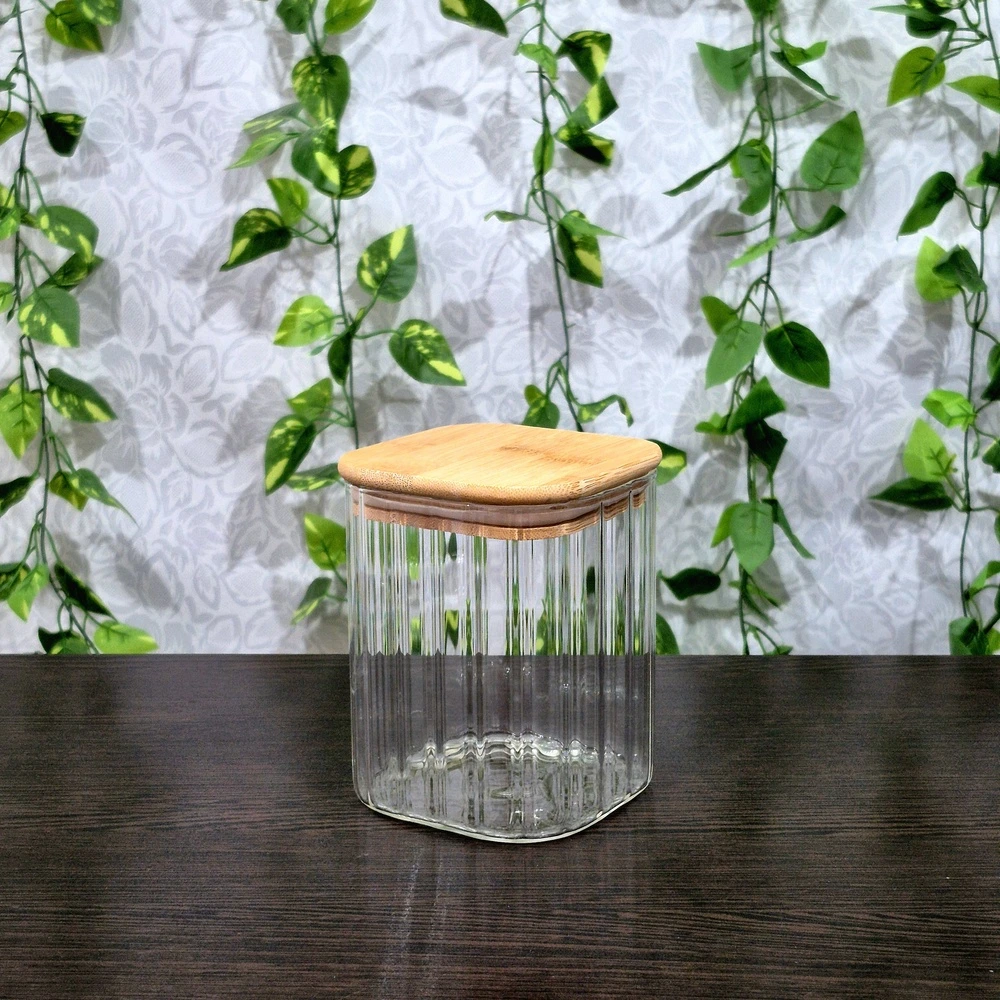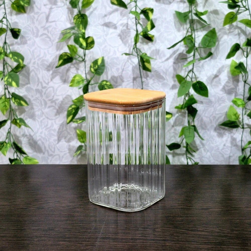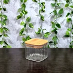خانه ظروف پیرکس بانکه پیرکس راه‌راه درب بامبو ابعاد کف ۱۰ × ۱۰ سانتی‌متر